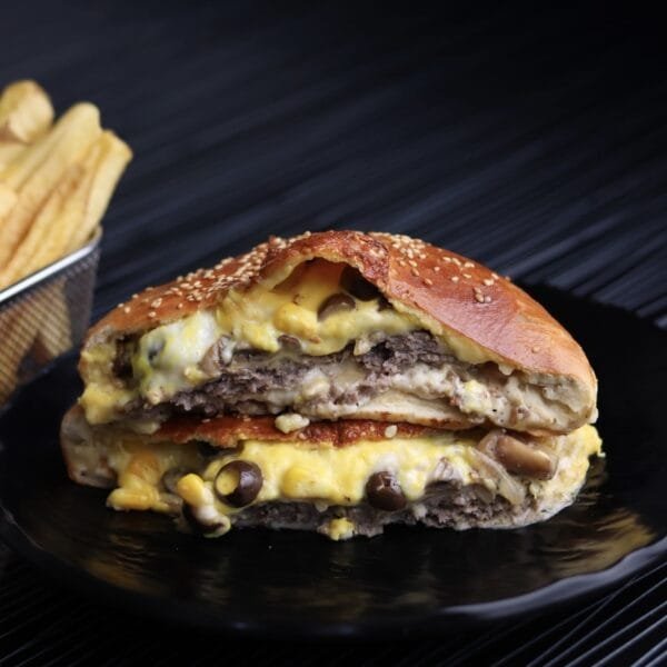 قطع برغر مشوية ع الفحم الحجري داخل عجين مع صوص الباربكيو و جبنة موزاريلا و جبنة الشيدر السائلة