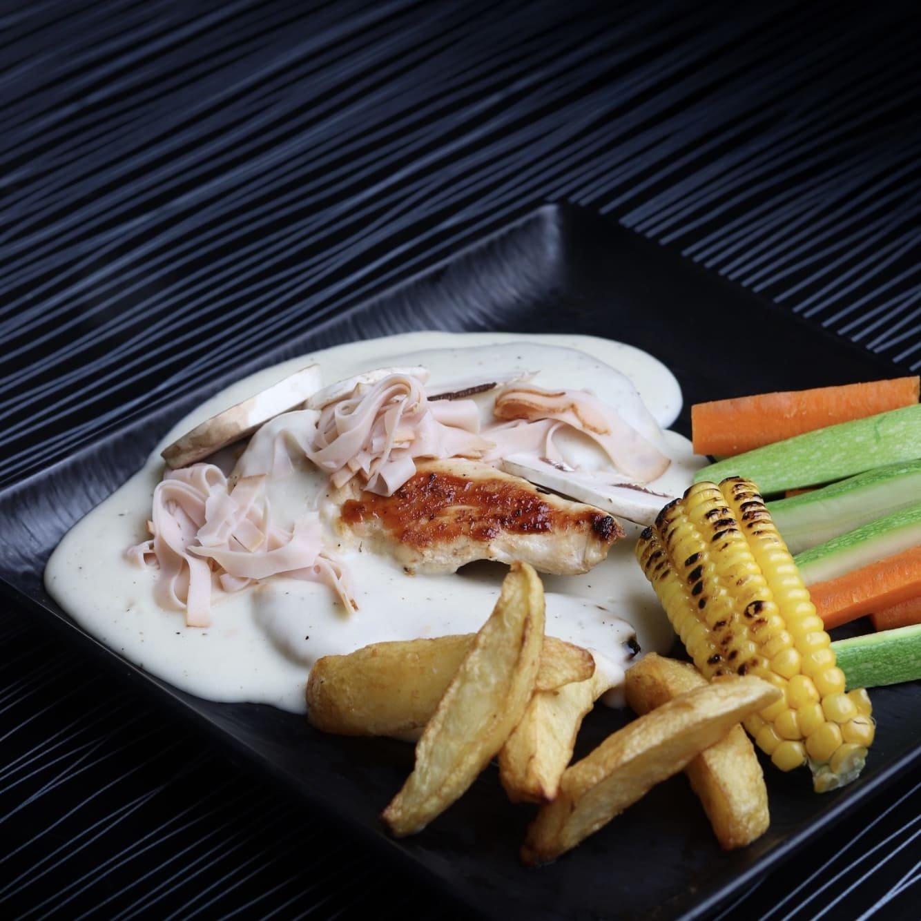 صدر دجاج مشوي مع صوص الأعشاب و لحوم باردة مع فطر فريش وخضار