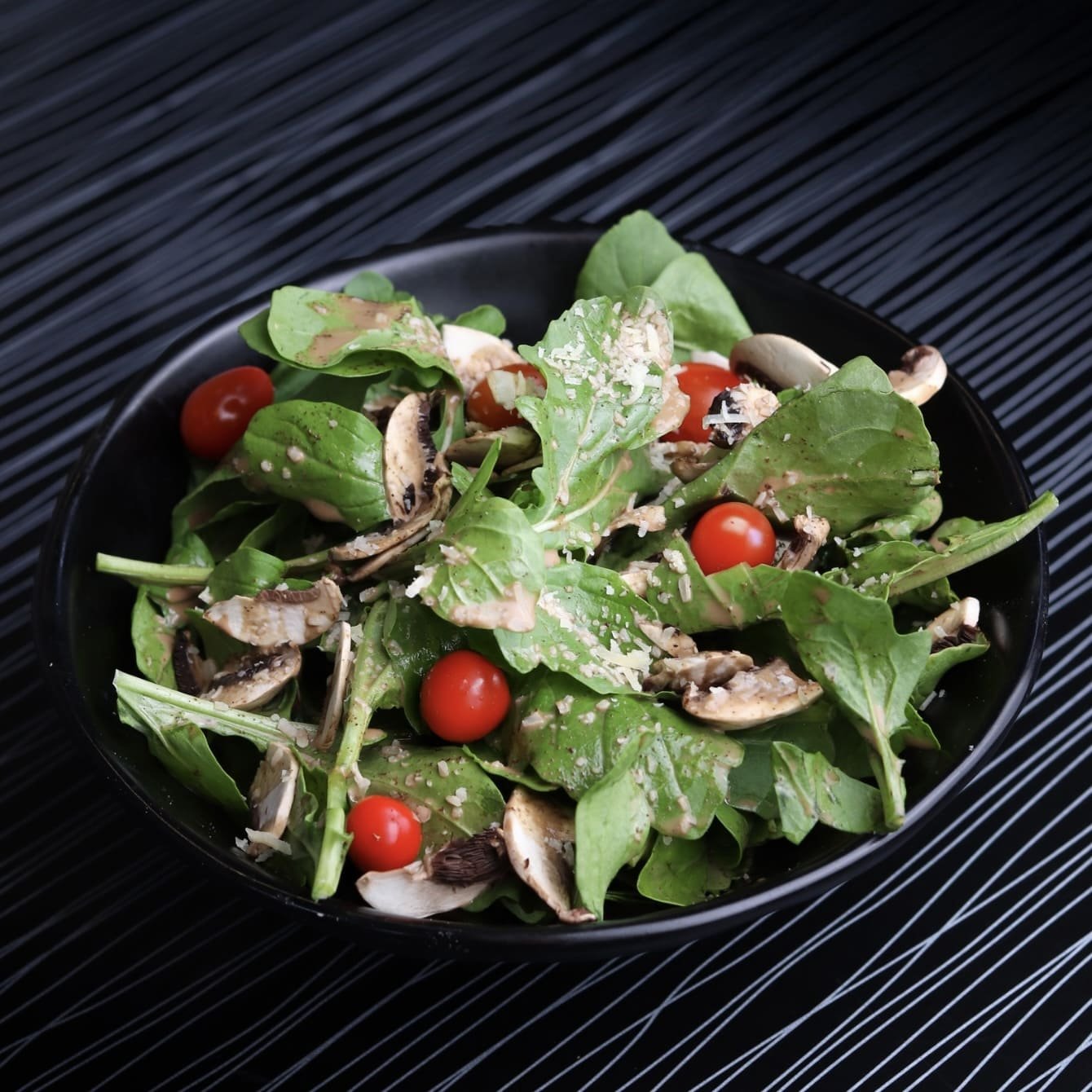 أوراق الجرجير مع مشروم فريش و بندورة كرزية وصوص البلسميك و جبنة البرمزان