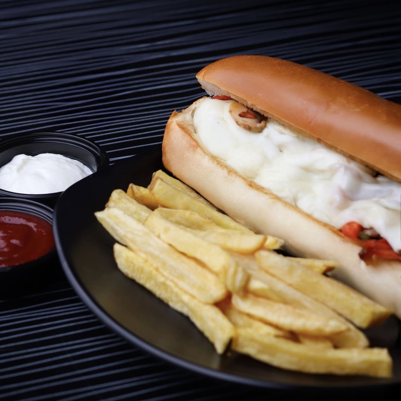 قطع دجاج مشوية مع مزيج من الخضار و الفطر مع جبنة الموزاريلا الذائبة و مايونيز تقدم مع أصابع البطاطا و سلطة كول سلو و كتشب