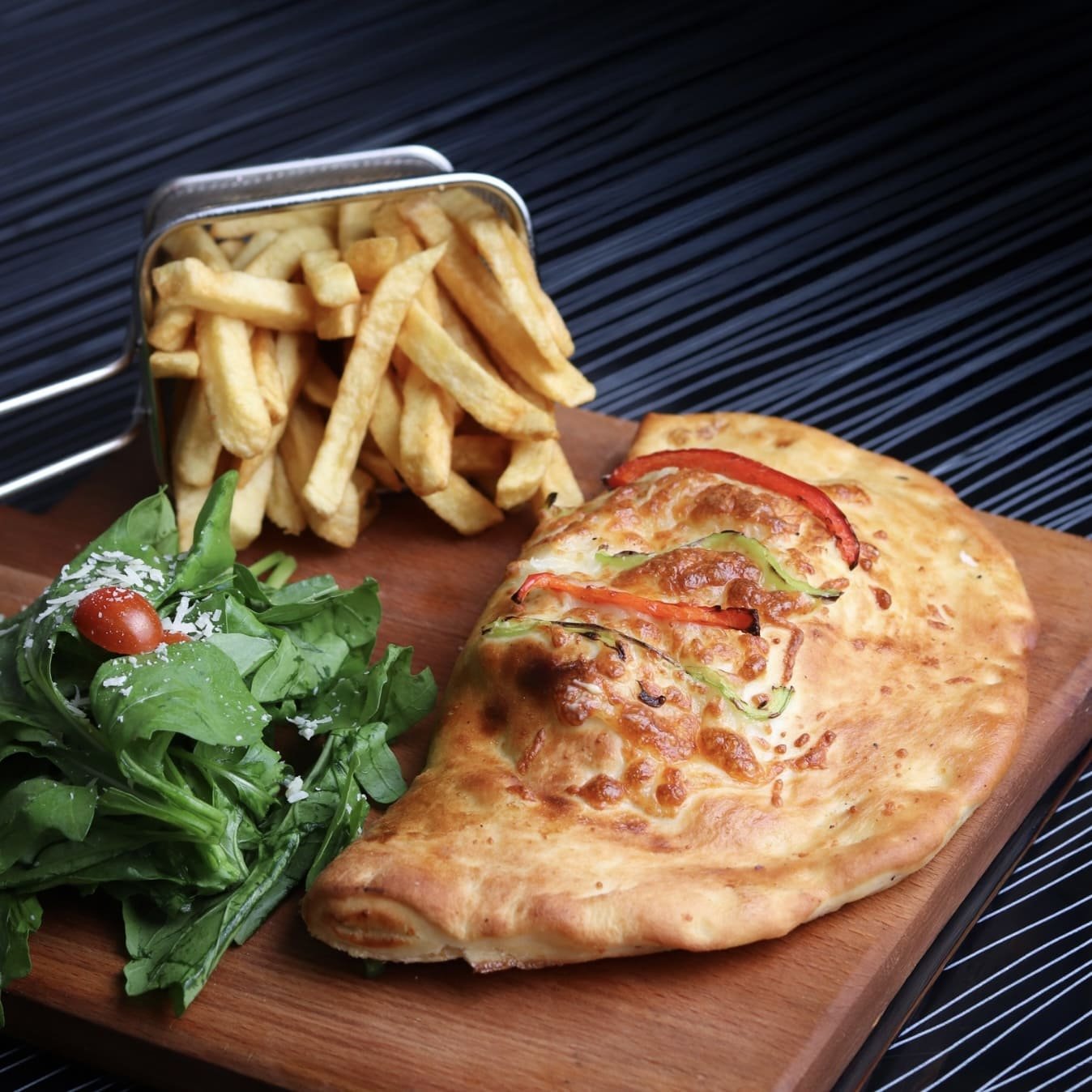 شرائح الشاورما الذهبية مغطاة داخل العجين مع صوص باربكيو و صوص رانش وموزاريلا وروستو مدخن