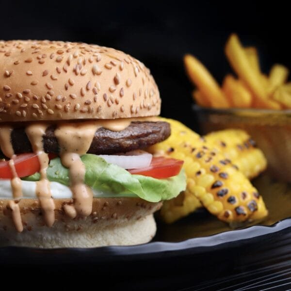 لحم برغر محشي بجبنة موزاريلا مشوي ع الفحم الحجري مع البصل والبندورة المشوية مع صوص تكساس ومخلل