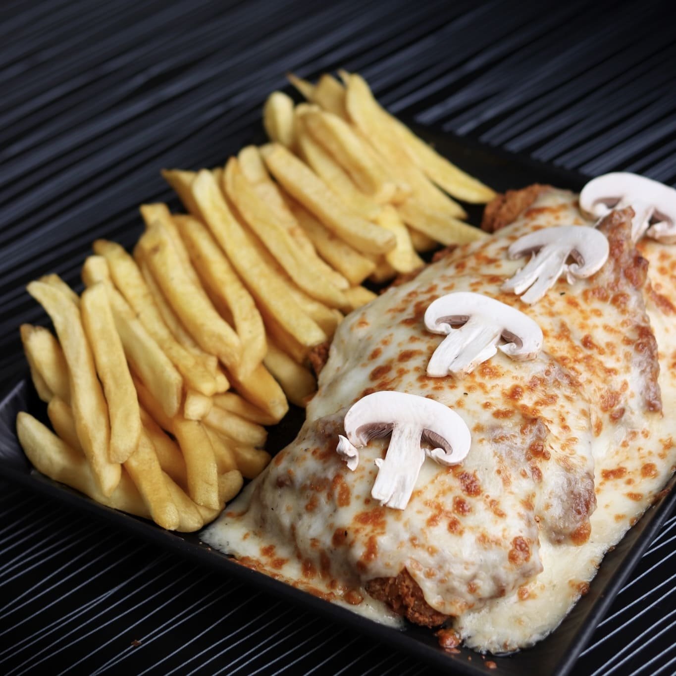 قطع عدد 4 من الدجاج المقلي المقرمش يقدم مع سلطة كول سلو و صوص الكريم وجبنة الموزاريلا الذائبة المحمرة مع فطر فريش و أصابع بطاطا و مايونيز