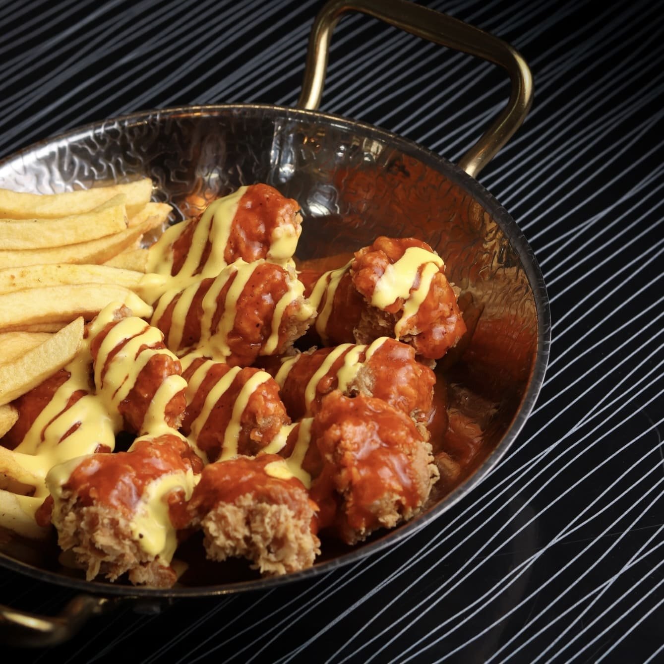 قطع عدد 10 من الجوانح المقرمشة مغطسة بصوص البوفالو الحار و صوص الشيدر تقدم مع أصابع البطاطا الذهبية و صوص رانش وسلطة كول سلو