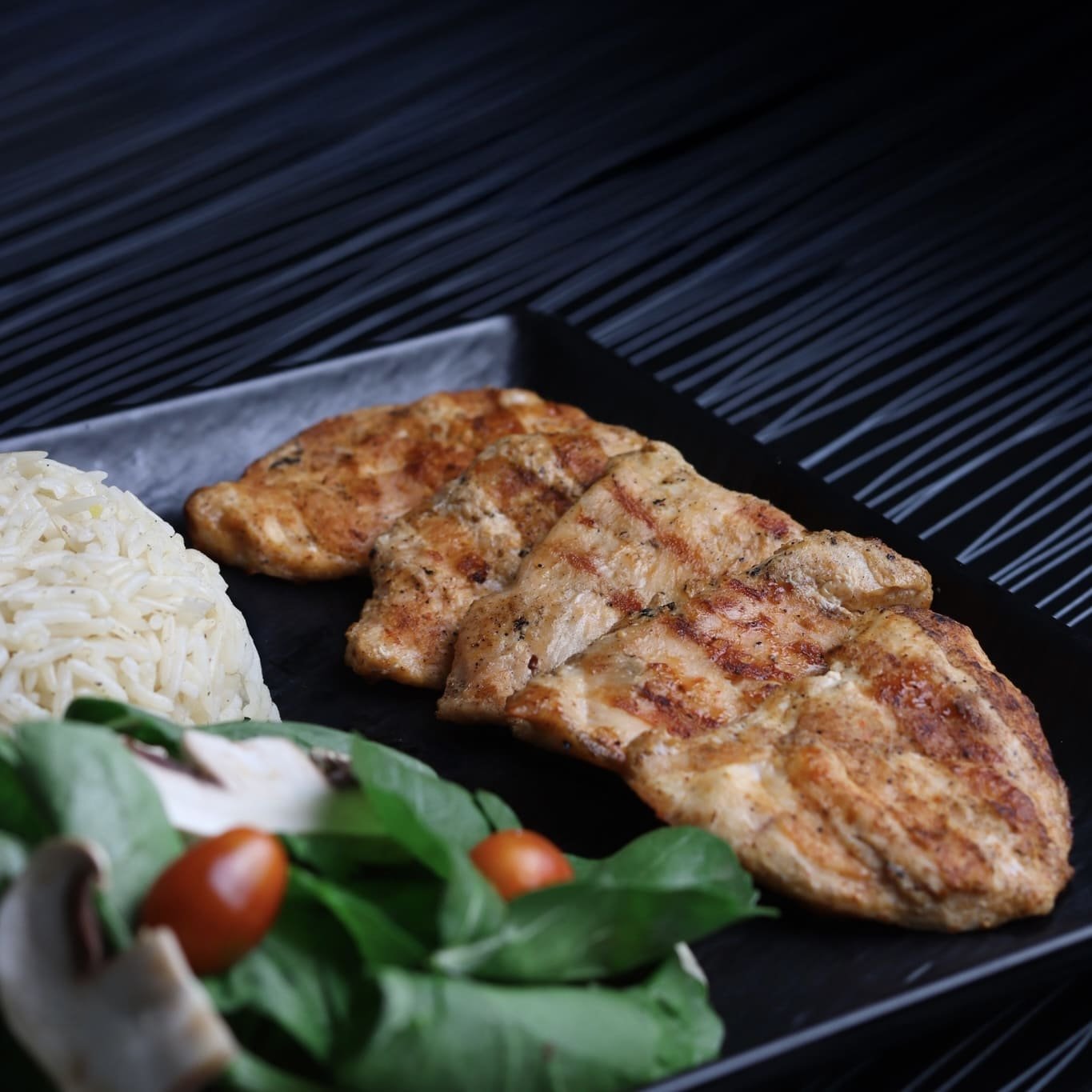 قطع عدد 6 من شرائح الدجاج المشوية على الفحم الحجري تقدم مع سلطة الجرجير المميزة و الأرز الابيض