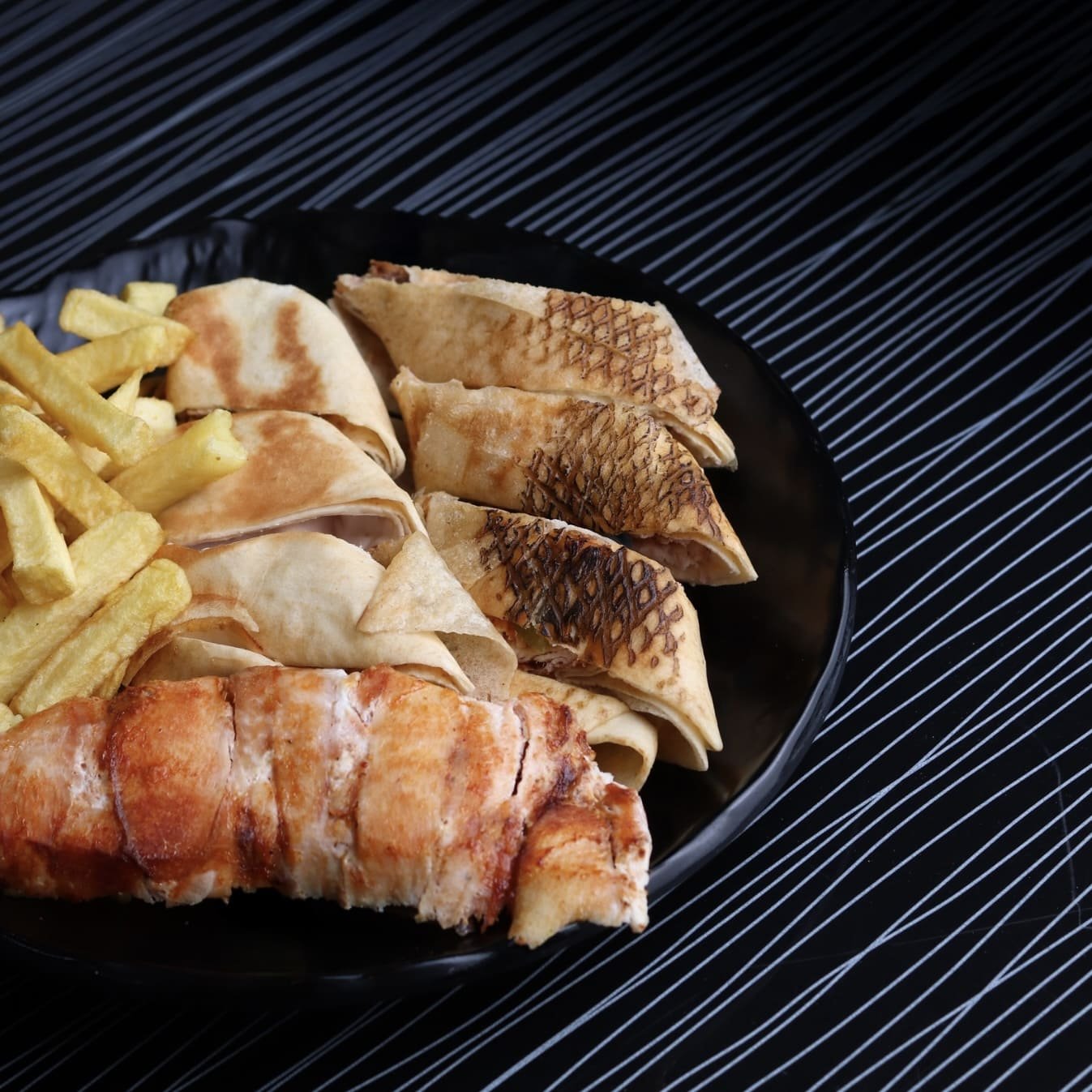 سندويش عربي عدد 2 مقطع مع شرائح الشاورما الذهبية تقدم مع بطاطا مقرمشة و كريم ثوم و مخلل و محمرة ودبس الرمان