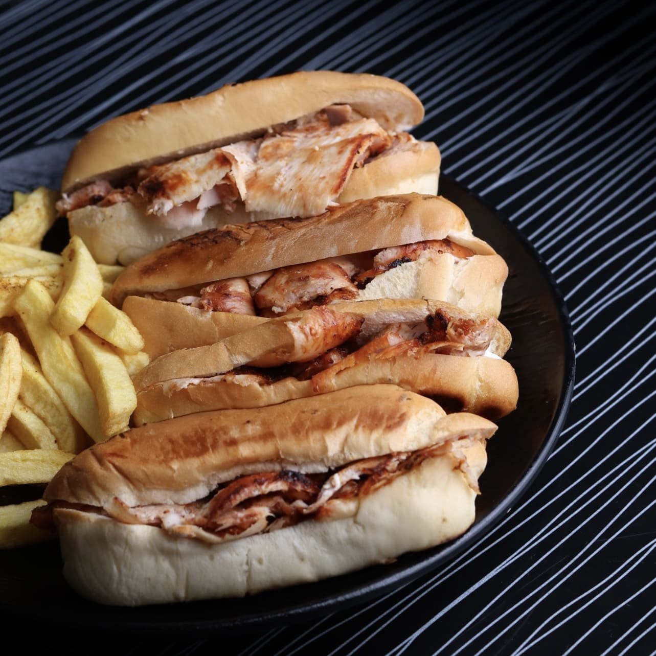 شرائح الشاورما الذهبية داخل خبز الصمون اللذيذ تقدم مع بطاطا مقرمشة وكريم ثوم ومخلل و دبس الرمان